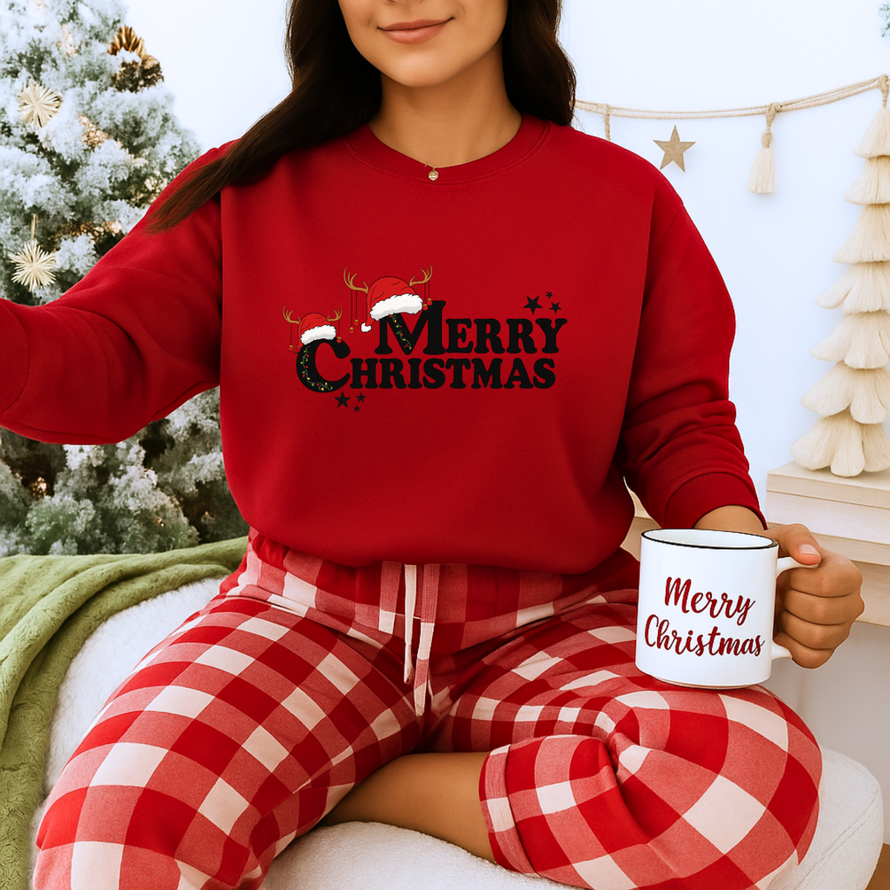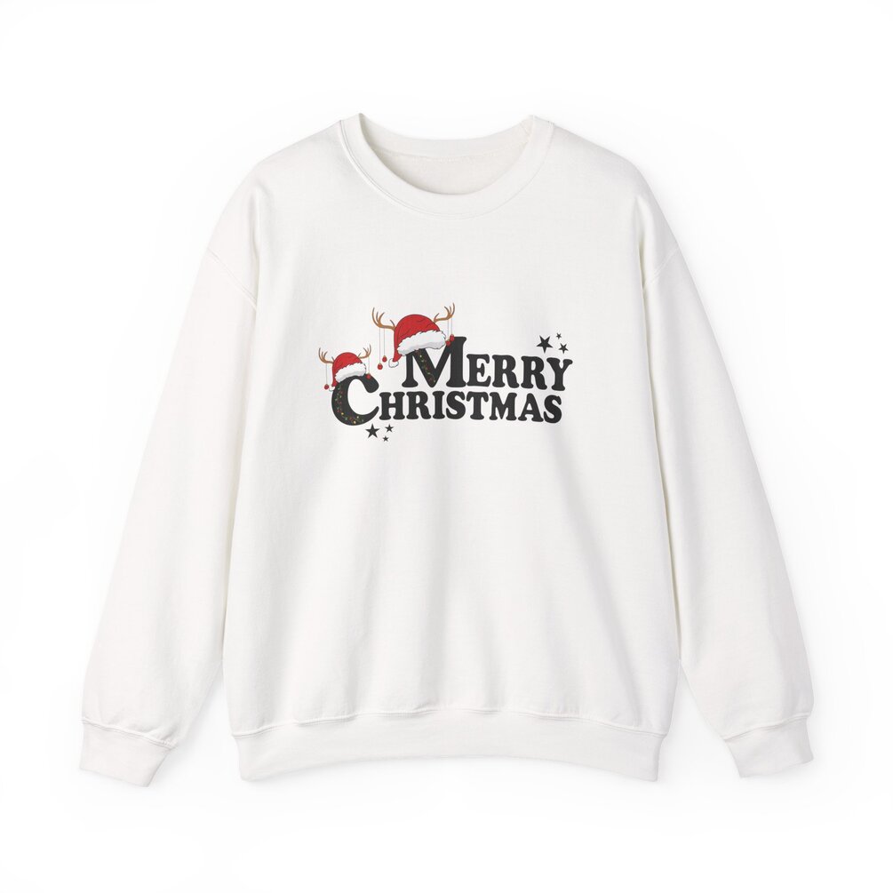 Unisex Heavy Blend™ Merry Christmas Sweatshirt – Festive Holiday Crewneck with Santa Hat & Reindeer | Unisex Winter Gift | mw2004