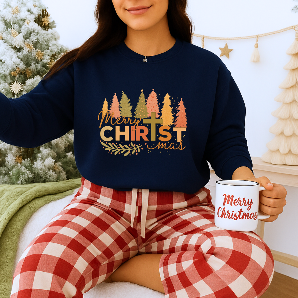 Unisex Heavy Blend™ mw2005 | Merry CHRISTmas Sweatshirt – Christian Holiday Crewneck with Cross & Trees | Faith Based Unisex Gift | Unisex Winter Gift